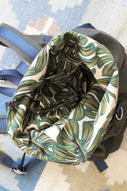 Okay, now on to version number two - with the exterior made from a beautiful waxed canvas and the lining made from Monstera Canvas by Cotton + Steel. The waxed canvas is the green color way but to say that the color is subtle would be an understatement. It's really quite hard to see any green in it. It probably looks more gray than anything. Both were purchased from Fancy Tiger Crafts, which may or may not be my new on-line guilty pleasure.